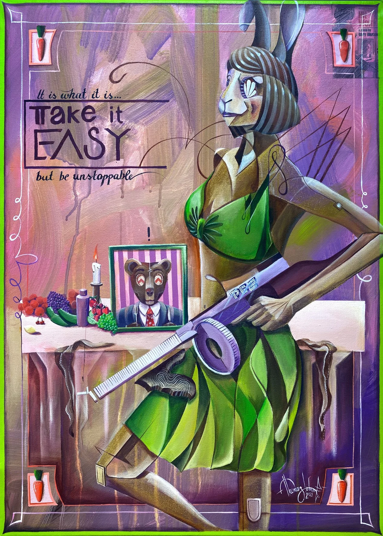 This acrylic painting explores the tension between impulse and restraint. It captures a moment of imbalance: a cat-headed woman lunges forward, driven by ego and desire to seize everything at once. Opposite her, a dog-headed man remains calm, composed, knowing that true power lies in waiting for the right moment to respond.