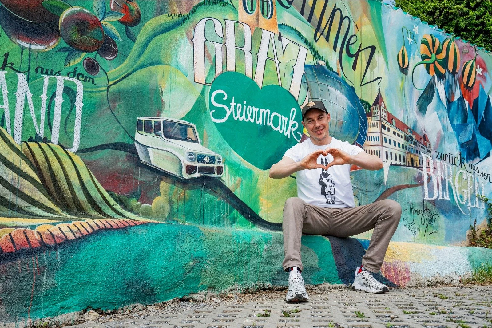 The mural captures the intersection where modern architecture meets UNESCO cultural heritage, all set against a backdrop of vineyards, iconic pumpkins, and the renowned Dachstein mountain region. At its heart stands Graz’s emblematic clocktower, the Uhrturm, flanked by the words “Willkommen in Graz” – “Welcome to Graz.”