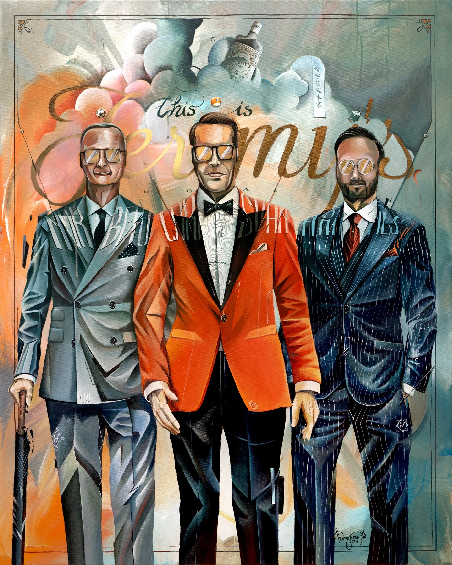 At the center stands a classic heroic composition. Three male figures in a confident frontal pose, shoulder to shoulder, like a modern triptych. Their gaze is directed forward, their posture upright, their silhouettes sharply defined. The background is playful, almost dreamlike. Between the brushstrokes, personal details are hidden. A Japanese banner bearing the word “Stammhaus” floats within the pictorial space. It symbolically represents the generosity of Jeremys, which dressed Tom for the World Expo 2025 in Osaka. Emerging between the color clouds, the in-house “Jeremys Gin” also makes an appearance.