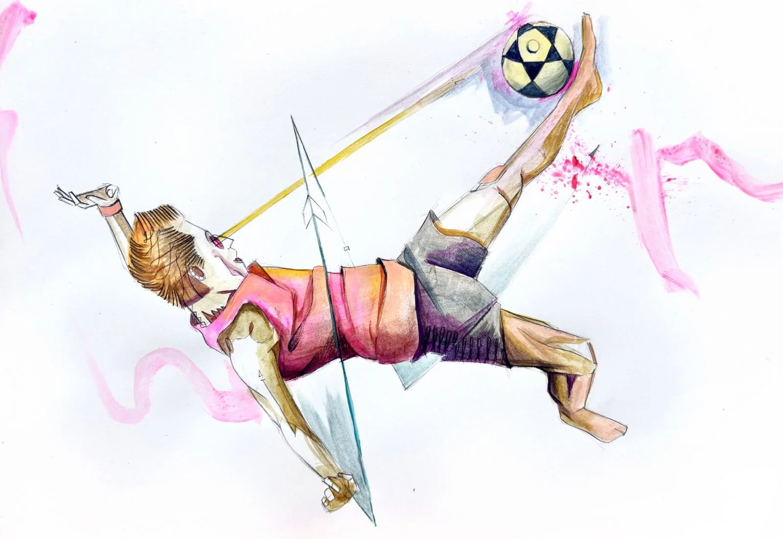 You can almost feel the energy in the vibrant pink splashes and the sharp, sketching lines. It’s that thin margin between total control and the sudden release, a state of pure presence where the game transforms into art. This work is about the focus, the freedom, and that one, perfect moment in the sand.